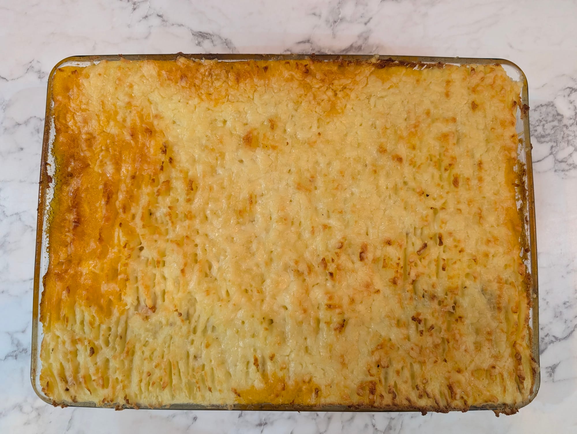 - Transfer the mince mixture to a large baking dish (or divide into individual containers). Top with the mashed potato and smooth it out with a fork.