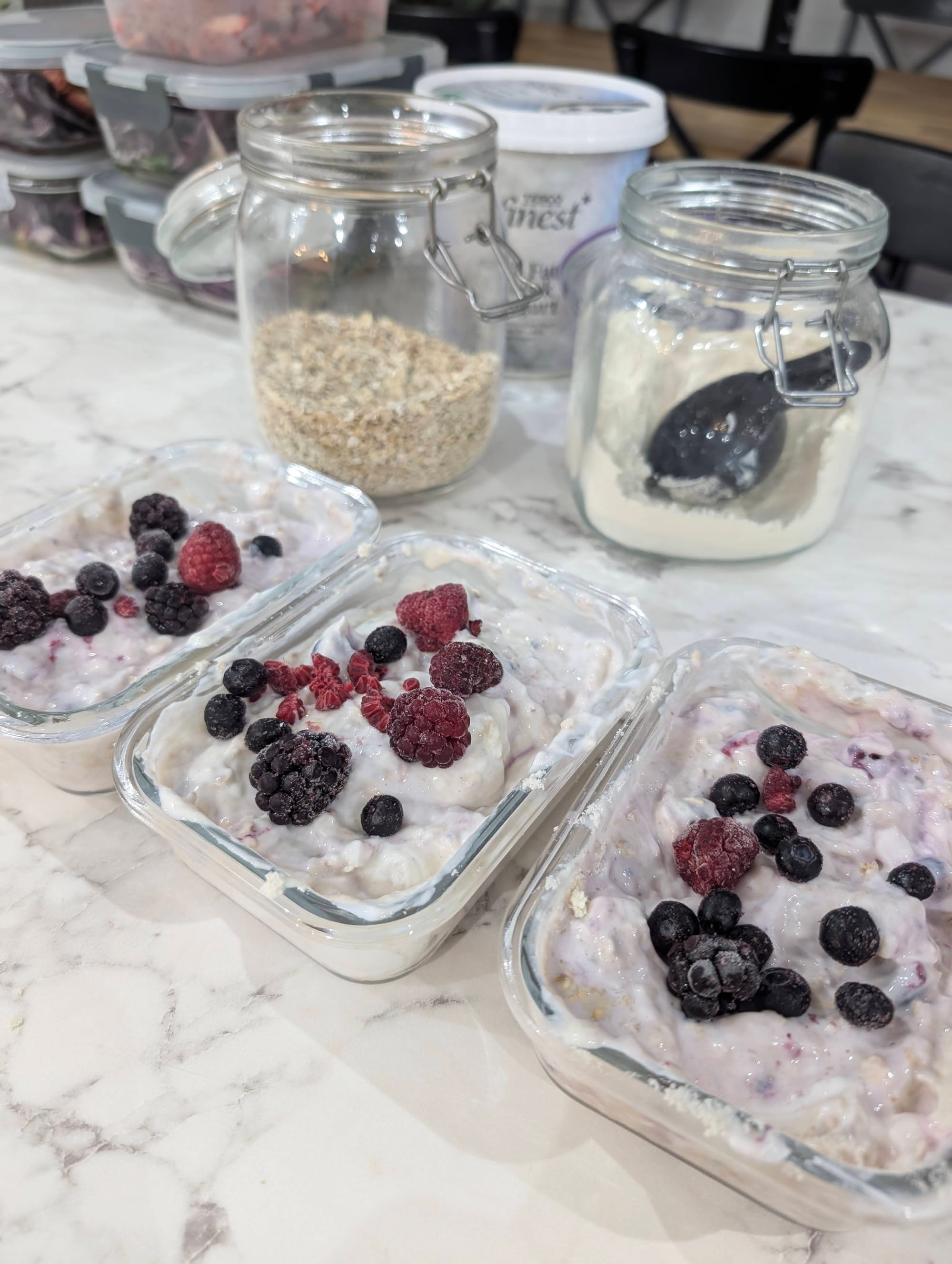 - Layer everything in a jar or container—oats, milk, protein powder, Greek yogurt, chia seeds, berries.