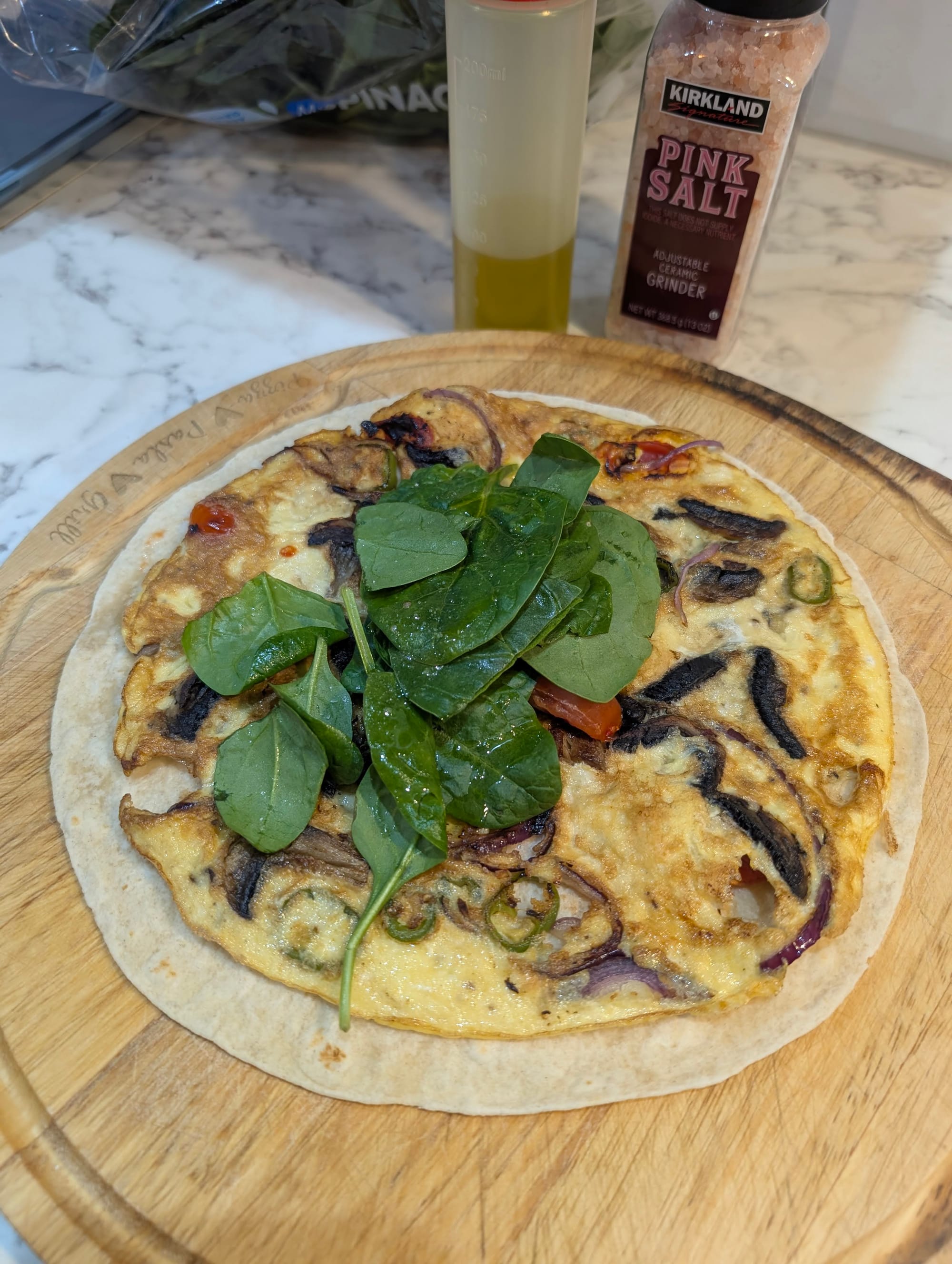 - Heat a little olive oil in a non-stick pan and sauté the onion, pepper, and mushrooms until soft. Add the spinach and let it wilt.