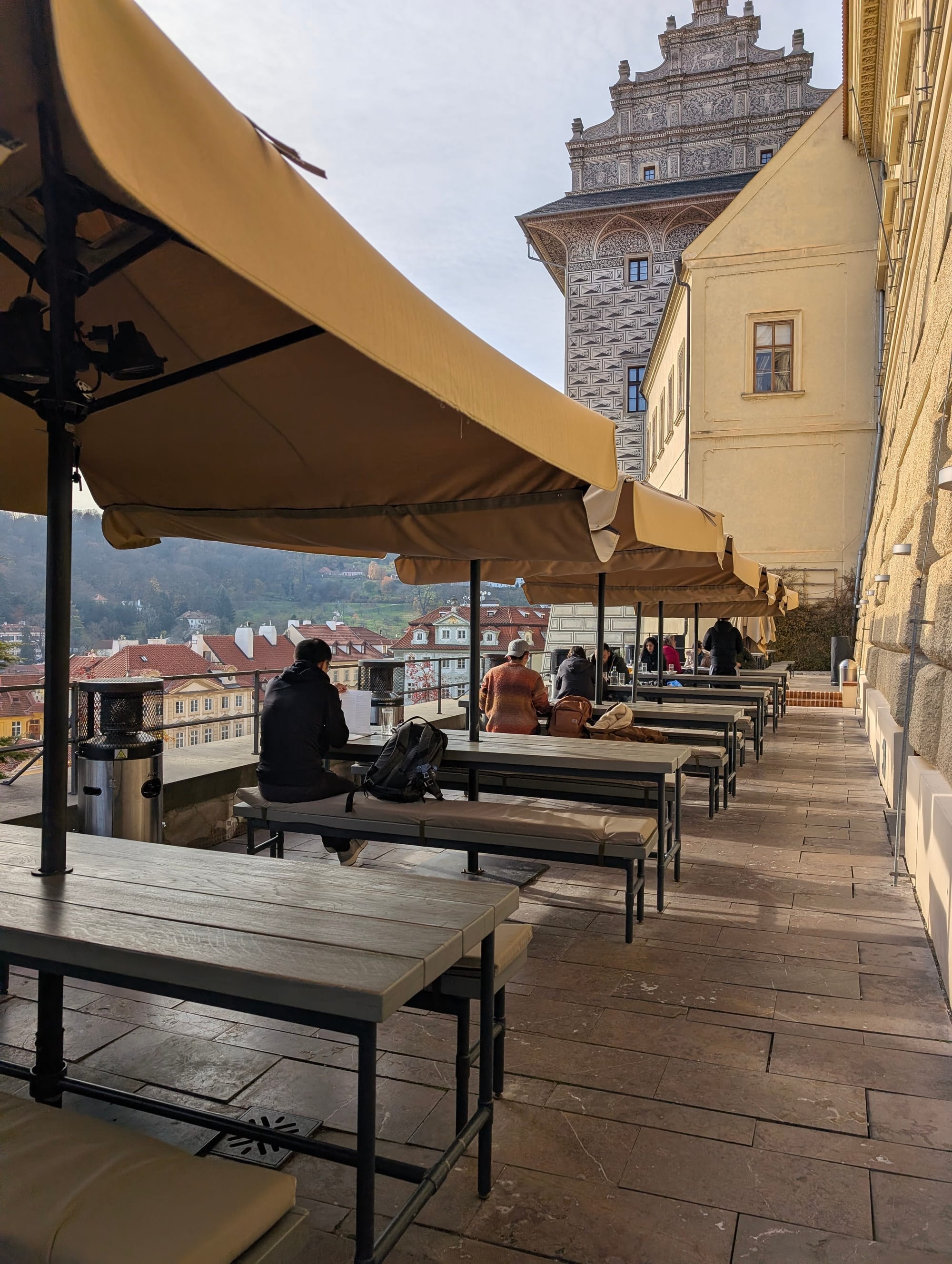 My friend (a local) messaged me and insisted I go here. It’s right next to Prague Castle, which usually signals "tourist trap," but this was the real deal. We actually sat on the terrace, despite the November chill – the view was just too good to leave.