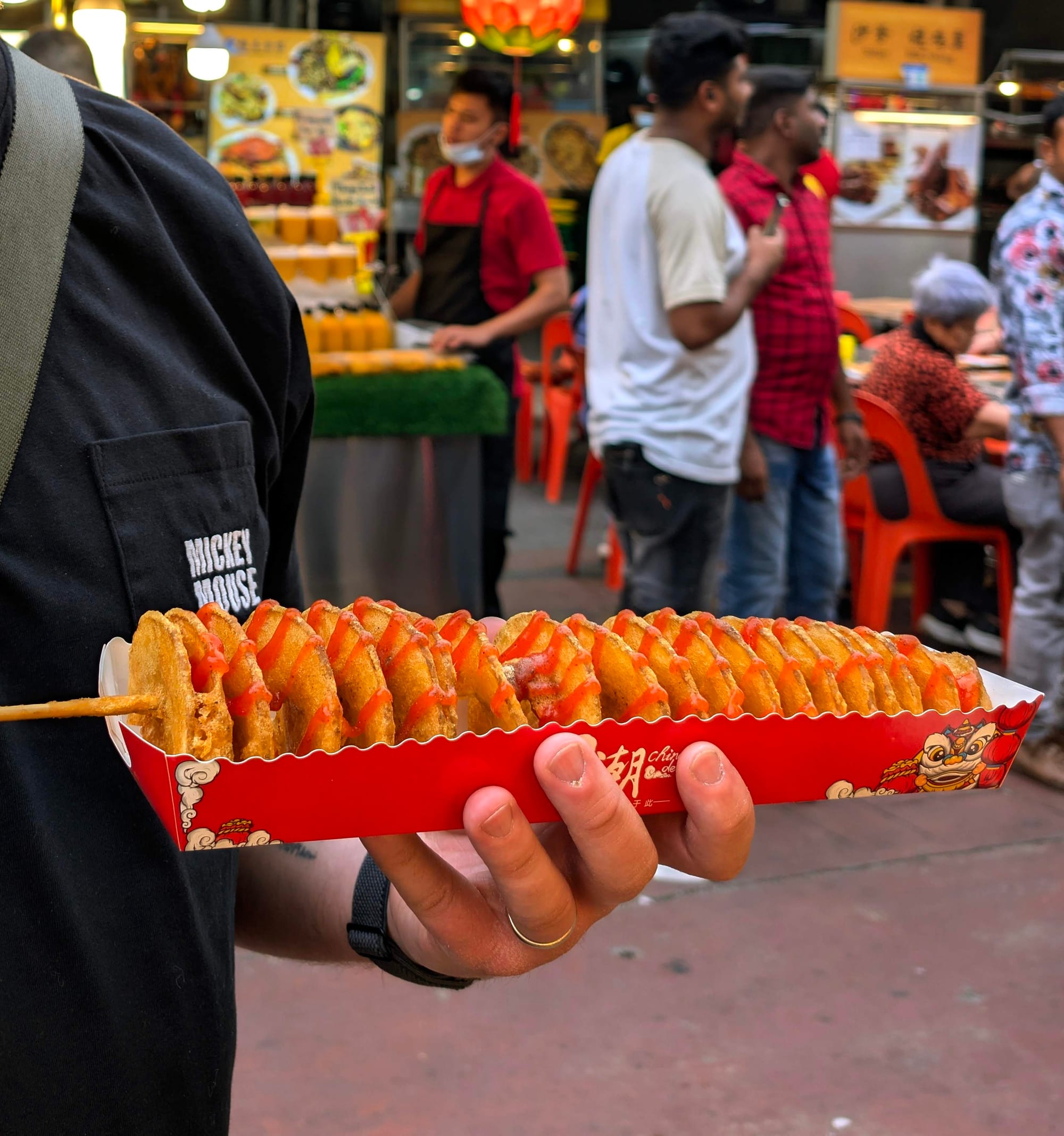 There were long, curled potatoes on a stick, proper tornado fries, and these extra-long, thin fries that looked almost too perfectly uniform to be hand-cut. I’m pretty sure they were made from reformed potato, but they were crispy, salty, and totally moreish. The kids loved the fried chicken stall and made a beeline for it more than once. They also couldn’t get enough of the corndogs, popcorn chicken, and chicken strips — classic comfort food, Jalan Alor-style.