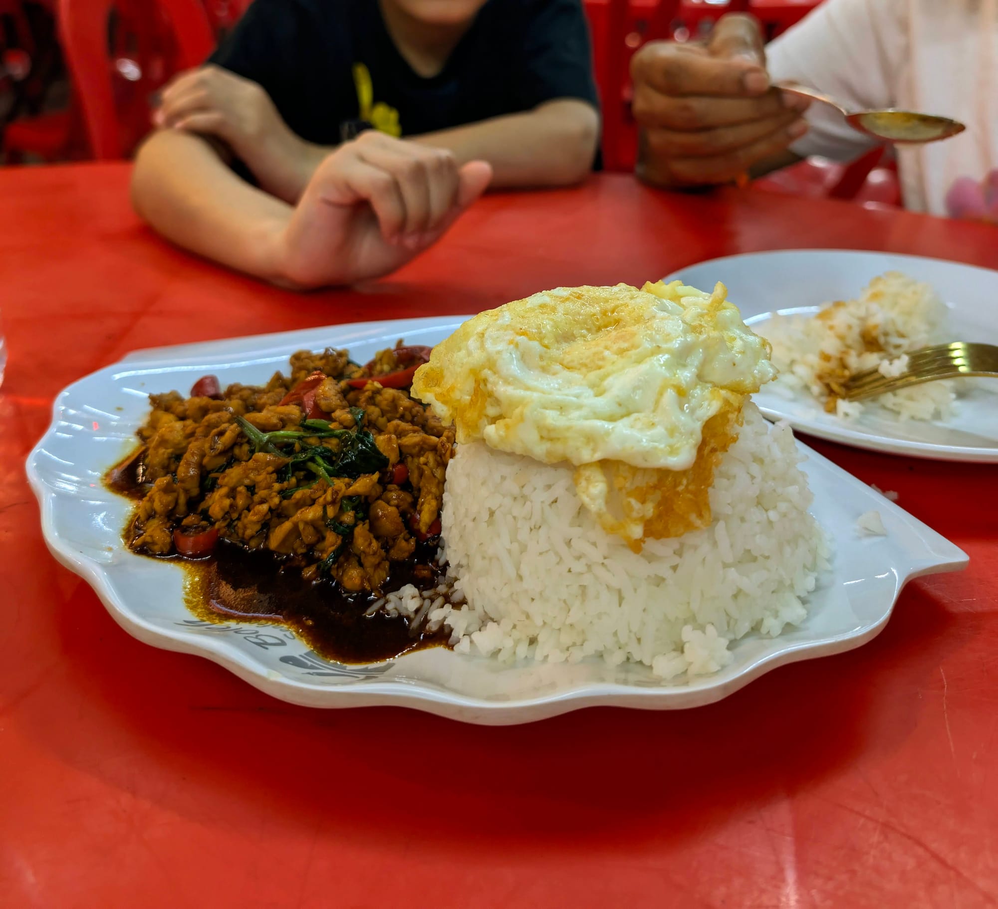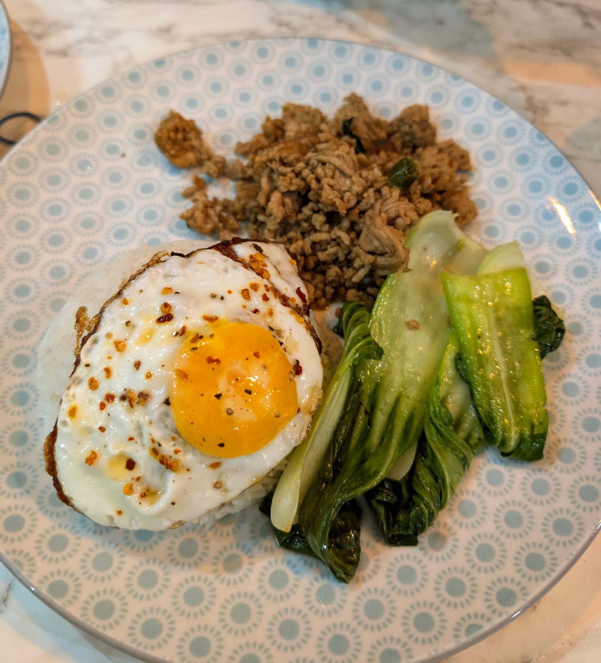 We tried so many different dishes over the course of our visits. There was one that became a fast favourite: minced chicken thigh with garlic and Thai basil, served with jasmine rice and a fried egg on top. This dish, also known as Pad Krapow Gai, became a bit of an obsession. I usually ordered it with garlic kailan, which is a leafy green a bit like pak choy. If you love garlic, this will be your heaven.