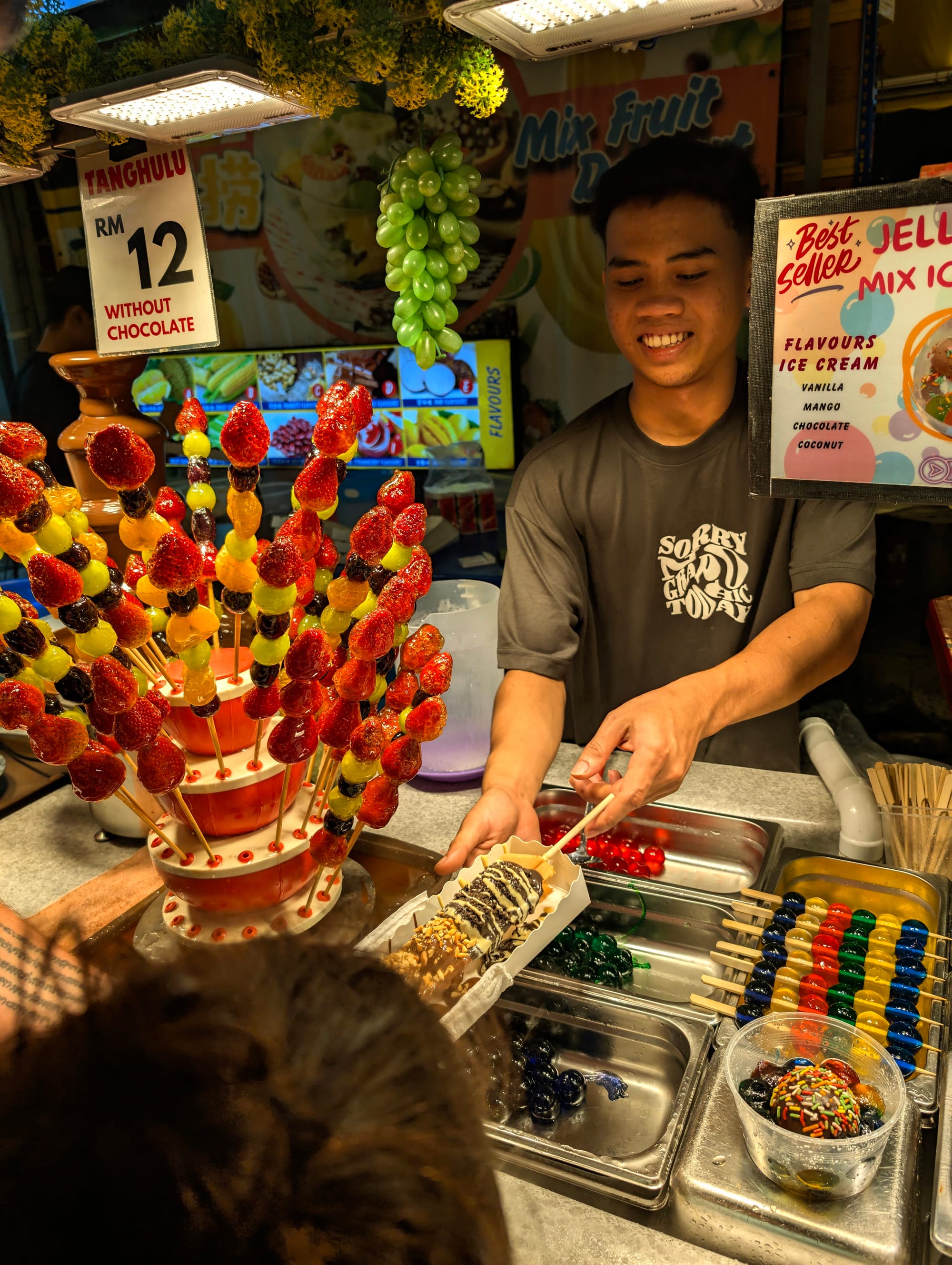 The kids were the first to spot the dessert carts. Giant bubble waffles drizzled in chocolate and topped with nuts, sprinkles, and every sweet you could imagine. Next to them, rainbow jelly balls carefully stacked on skewers like edible jewels. They looked almost too pretty to eat.