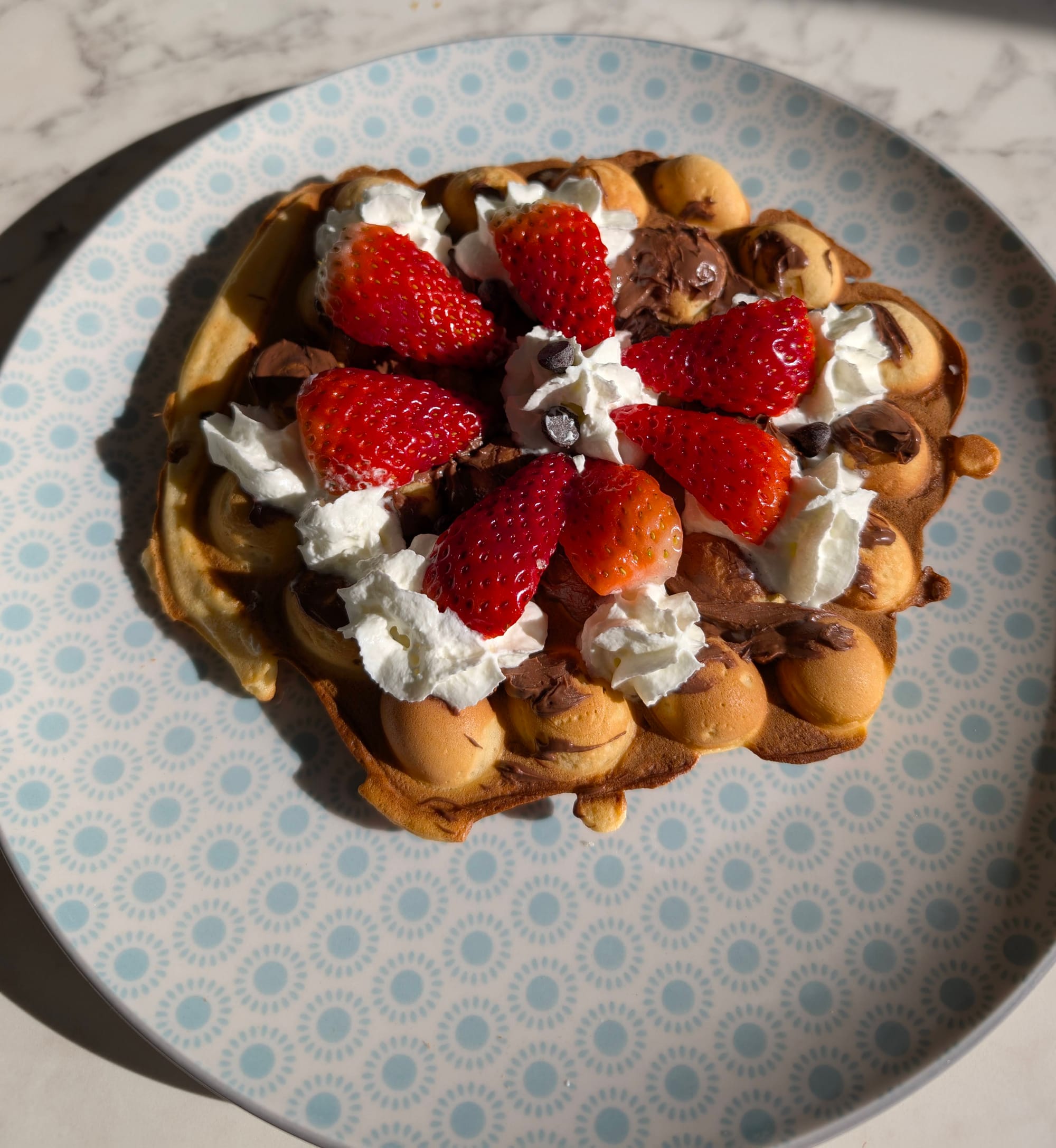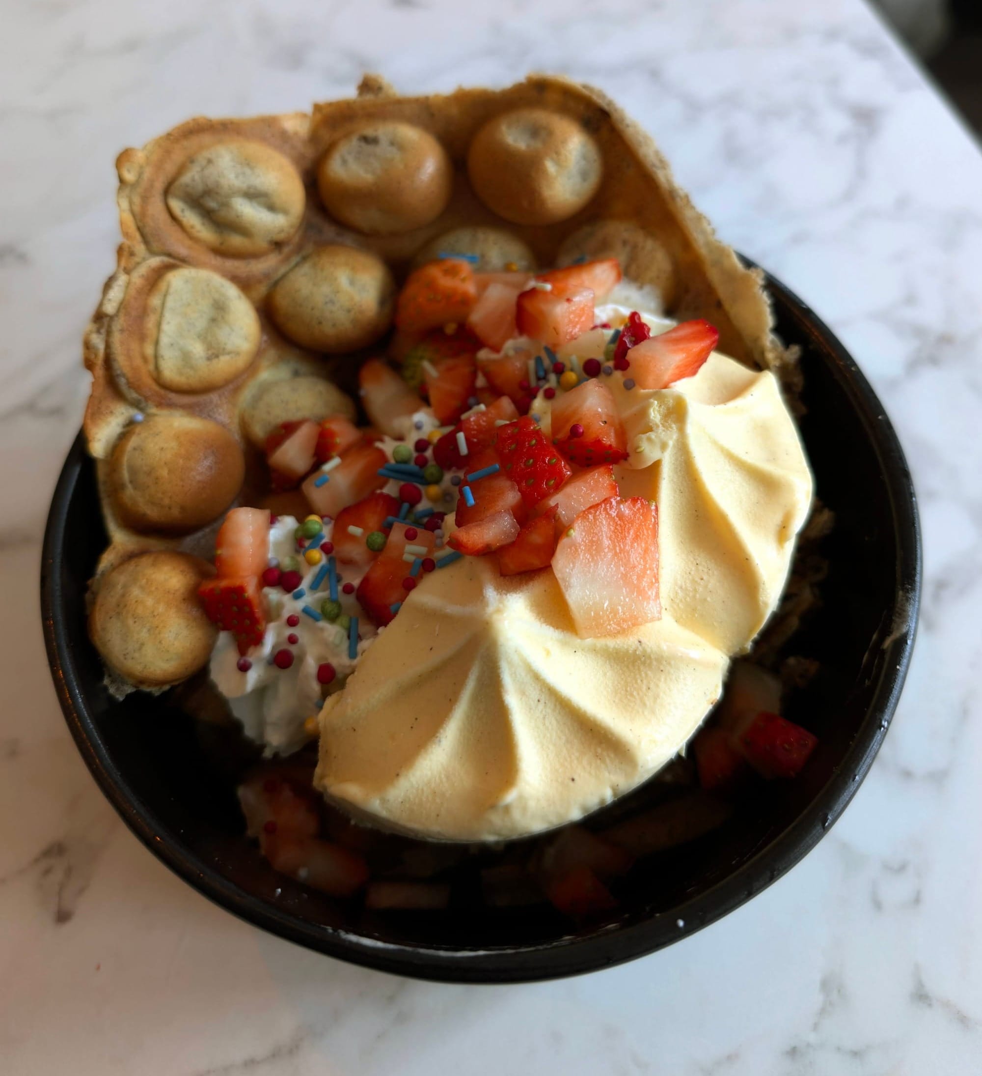 And then, the bubble waffle. Oh my. Crispy on the outside, soft and cake-like on the inside, with a delicate vanilla flavour. Each bubble could be filled or topped with your choice of treats. We went for a mix — dark chocolate, white chocolate, strawberries, nuts. It was pure joy. Definitely a core memory. If you’re wondering how to make one yourself, I’ll share the recipe further down. You can also jazz up your bubble waffle batter in lots of fun ways. Try adding crushed biscuits, matcha, or cocoa powder to the mix. It's fun to experiment with different textures and flavours. A sprinkle of colourful toppings adds a lovely crunch and a pop of colour too.