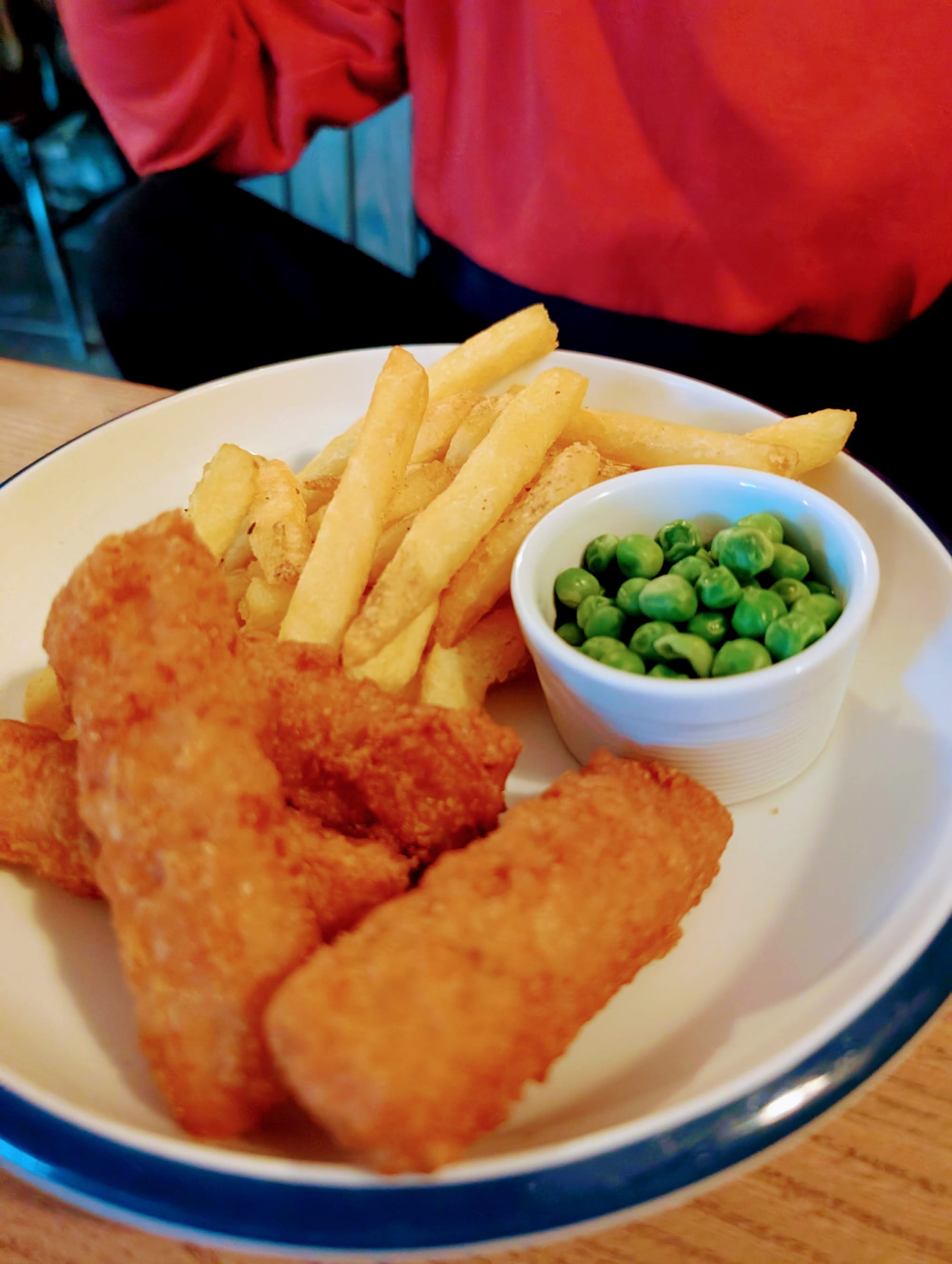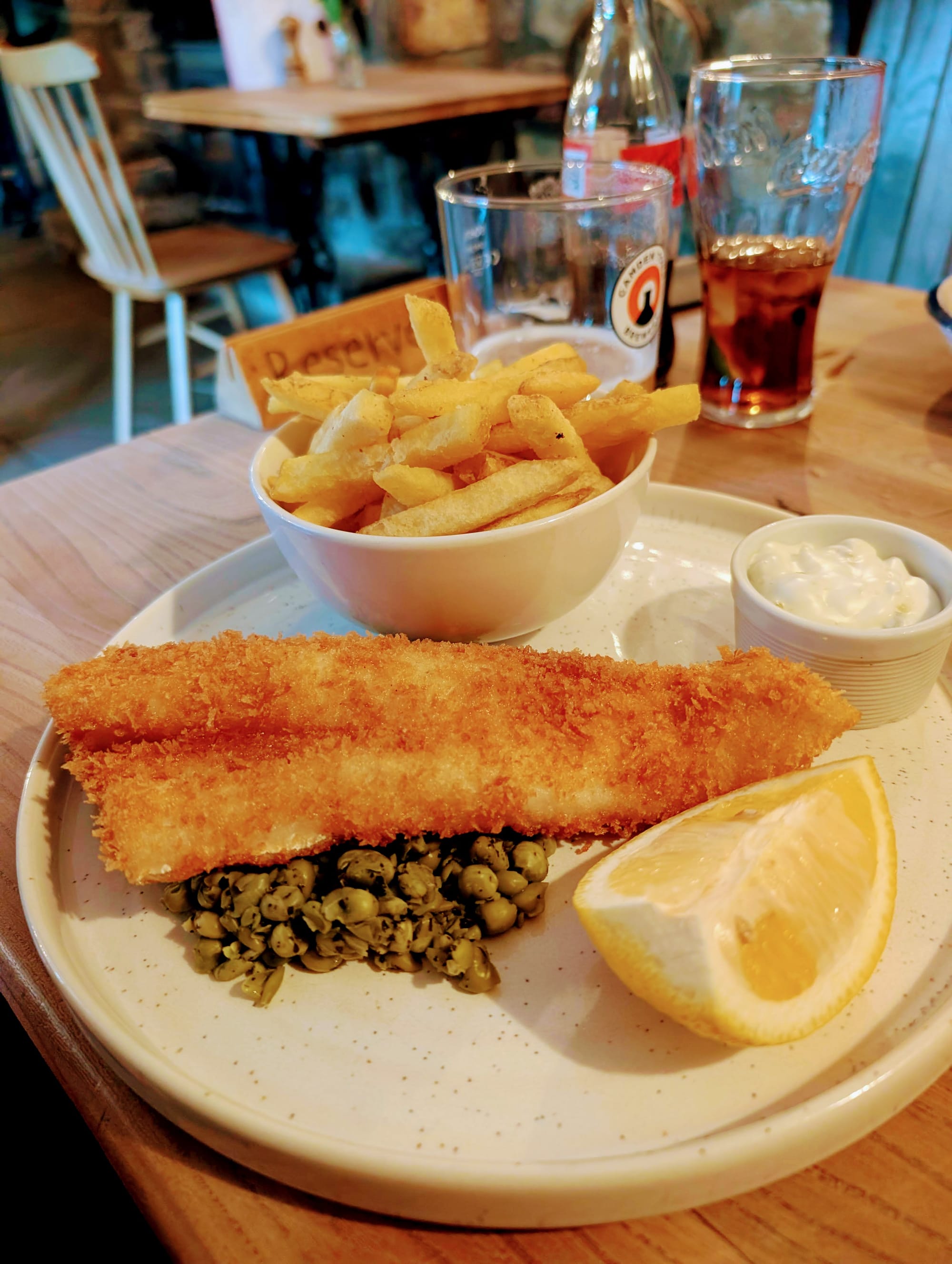 We ordered the lamb shoulder roast with red cabbage, sweet-potato mash and crisp roasties – the kind of plate that doesn’t need embellishment. My husband’s breaded haddock arrived perfectly golden, with minted peas and fries that actually deserved the word. The kids had fish goujons and chips, no complaints registered. Happy bellies all round.